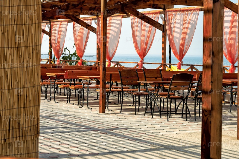 Освещенная солнцем деревянная палуба ресторана со столаями и стульями в океане
