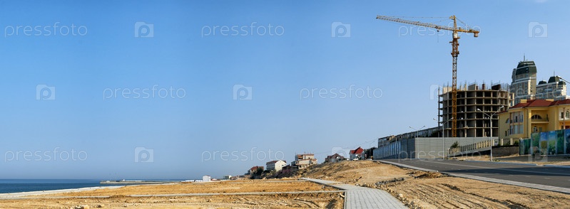 Строительство нового многоэтажного жилого здания вс видом на Каспийское море на прибрежном пляже в Актау