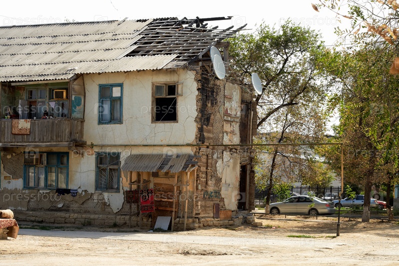 Двухэтажное городское здание со структурными повреждениями, обвалившейся крышей и разрушенными секциями стен в результате суровых погодных условий, ожидающее ремонта и реконструкции