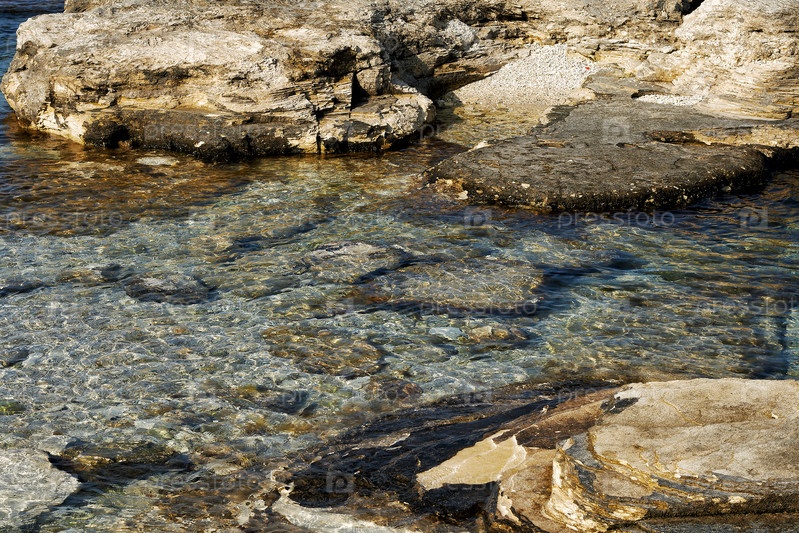 Чистая вода с искрами солнечного света в окружении гладких омытых водой камней на берегу моря