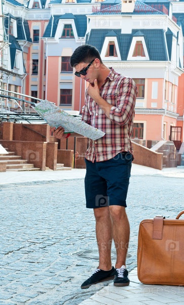 Молодой человек с чемоданом задумчиво глядит в карту на улице города