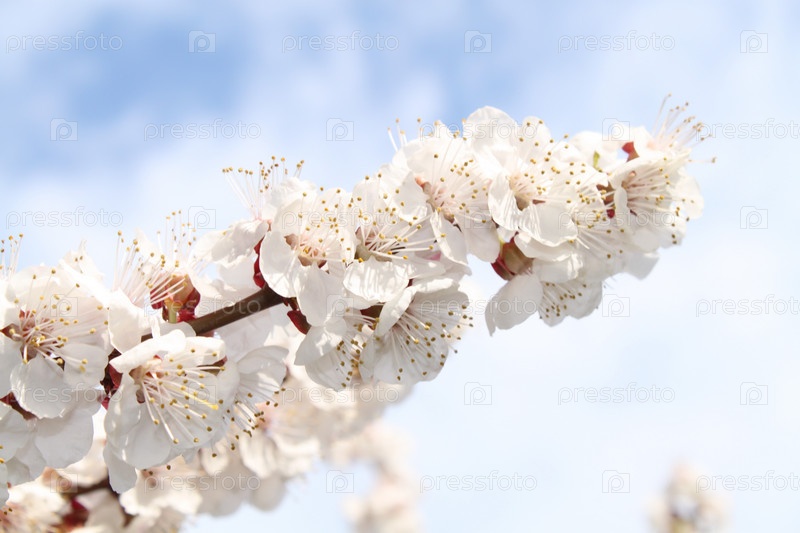 Цветущая ветвь абрикоса на фоне голубого неба, крупный план