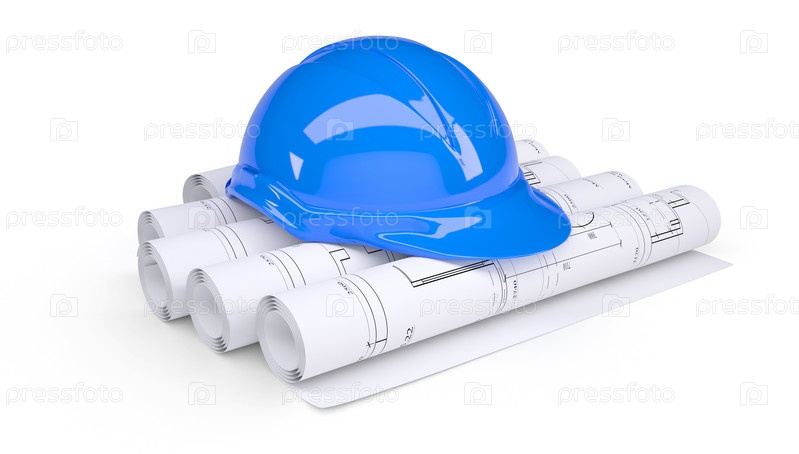 Синий строительный шлем на рулонах с чертежами на белом фоне