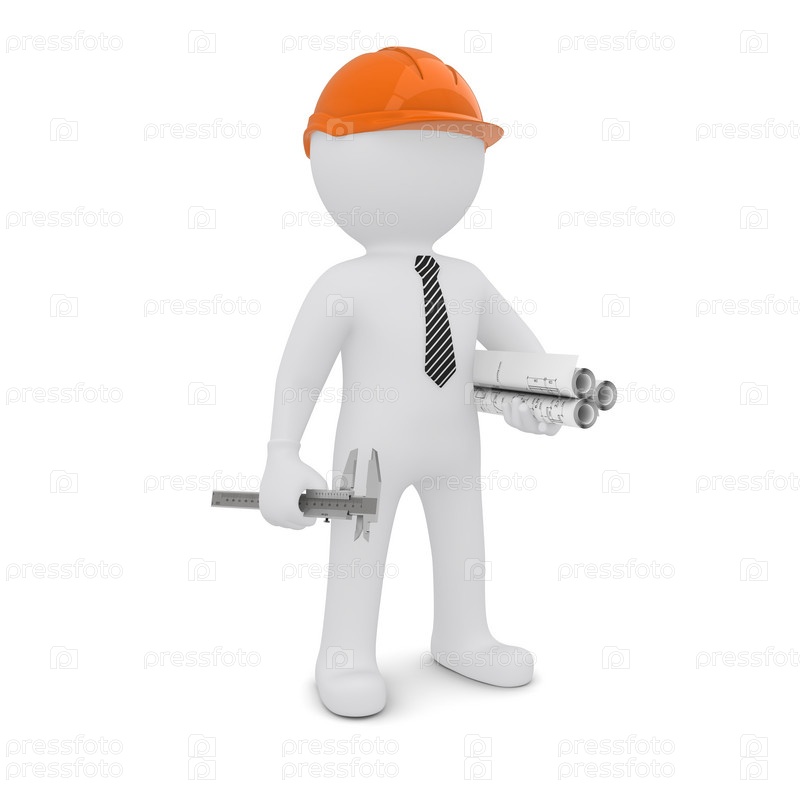 Белый человек в оранжевом шлеме с чертежом и суппортом на белом фоне