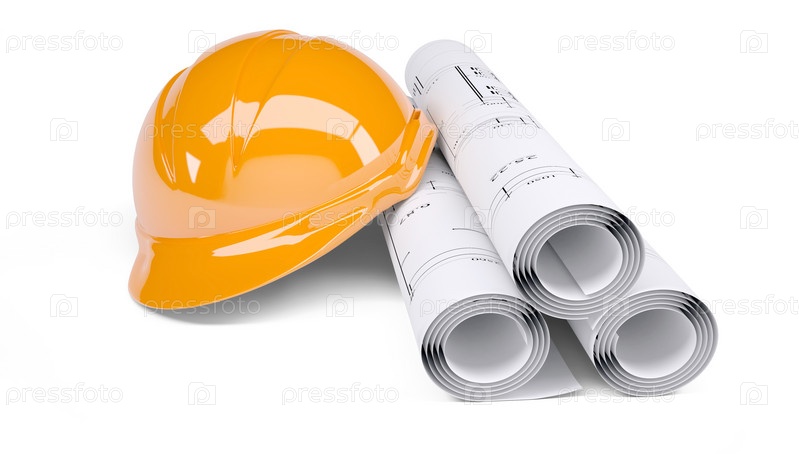 Желтый строительный шлем на рулонах с чертежами на белом фоне