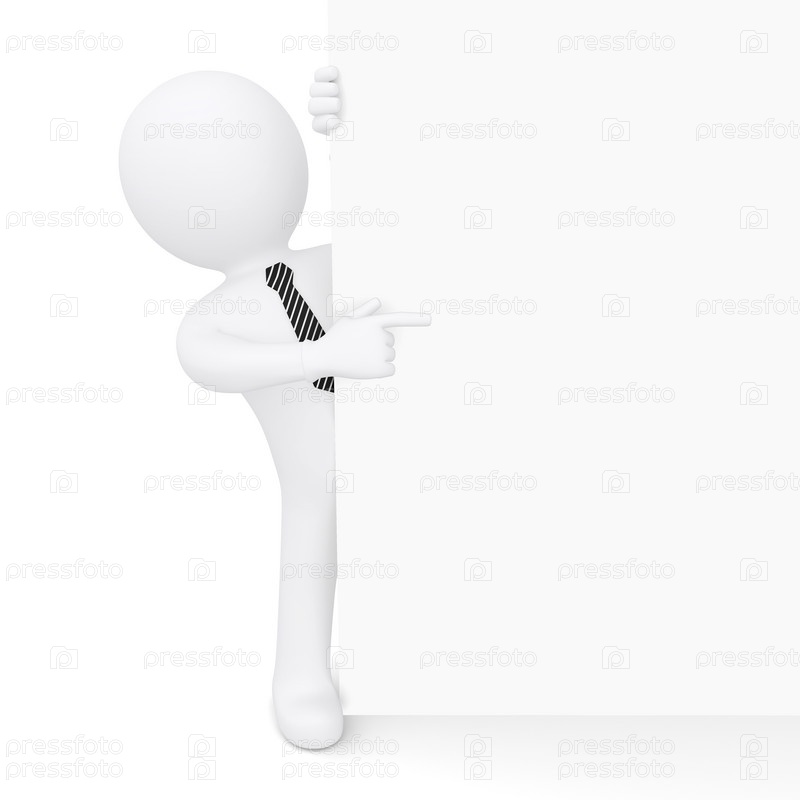 Белый человек выглядывает из-за белой стены и указывает пальцем на нее, изолированный на белом фоне