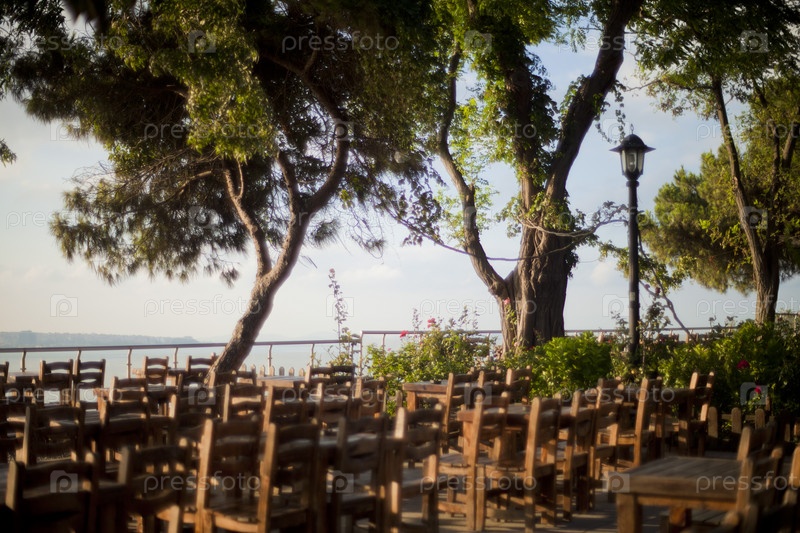 Терраса в лучах утреннего солнца в парке Гюльхане в Стамбуле