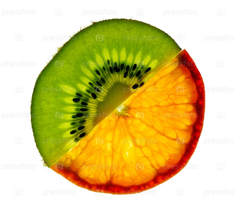 Кусочки киви и мандарина на белом фоне