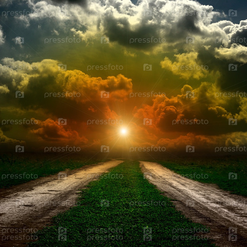 Дорога в поле, грозовые облака и солнце