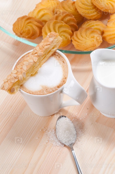 Завтрак с кофе и свежими хлебобулочными изделиями на натуральном сосновом столе
