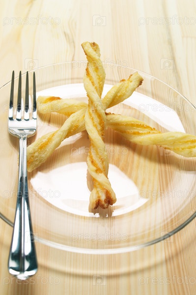 Палочки из слоеного теста на прозрачной стеклянной тарелке на сосновом столе