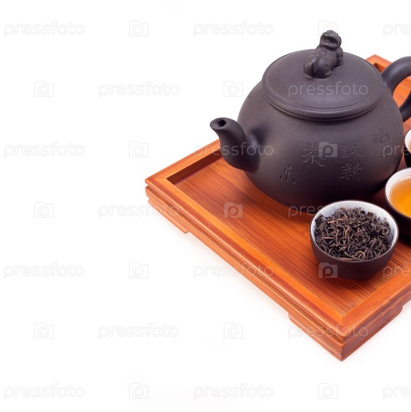 Кружки с китайским зеленым чаем и чайник на деревянном лотке