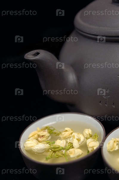 Китайский чай с жасмином в кружках и чайник на черном фоне