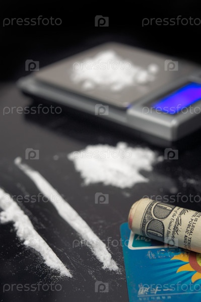 Кокаин и цифровые весы на черном фоне. Концепция употребления наркотиков