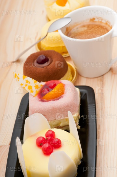 Кофе эспрессо и фруктово-сливочное пирожное крупным планом