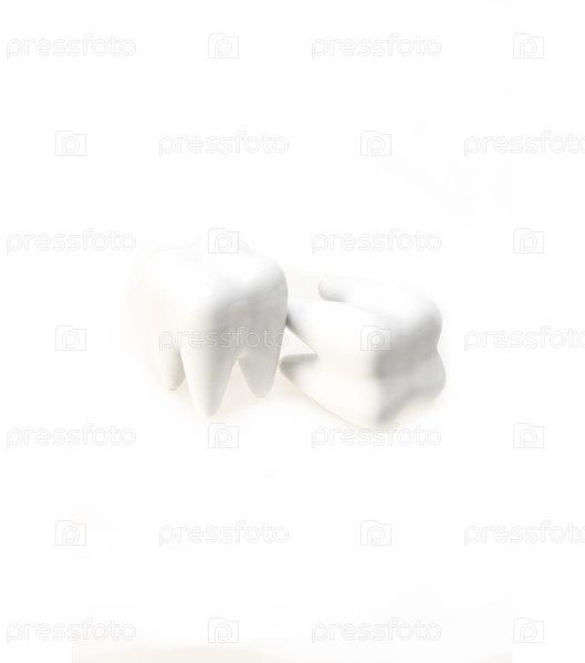 Два искусственных зуба крупным планом, изолированные на белом