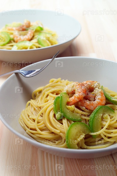 Спагетти со свежим креветками и соусом цукини на тарелке