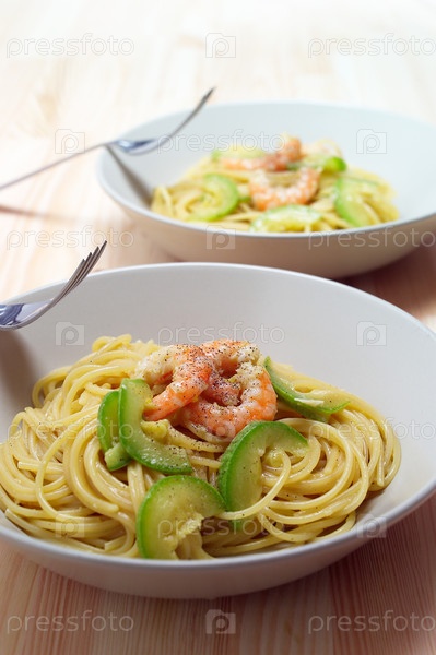 Спагетти со свежим креветками и соусом цукини на тарелке