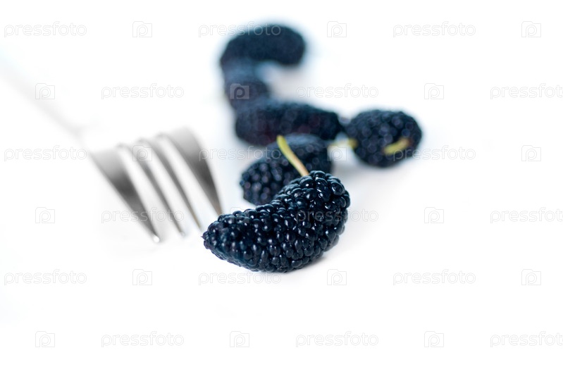 Свежие спелые ягоды шелковицы с вилкой крупным планом на белом фоне