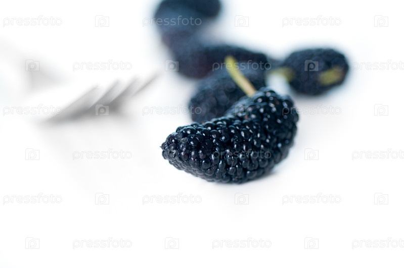 Свежие спелые ягоды шелковицы с вилкой крупным планом на белом фоне