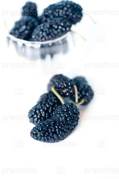 Свежие спелые ягоды шелковицы в стеклянной миске крупным планом на белом фоне