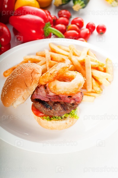 Классический американский гамбургер с кольцами лука, картофелем фри и свежими овощами