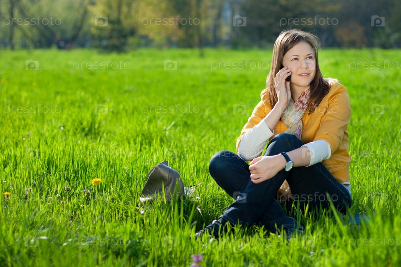 Молодая женщина, сидя на траве, разговаривает по мобильному телефону