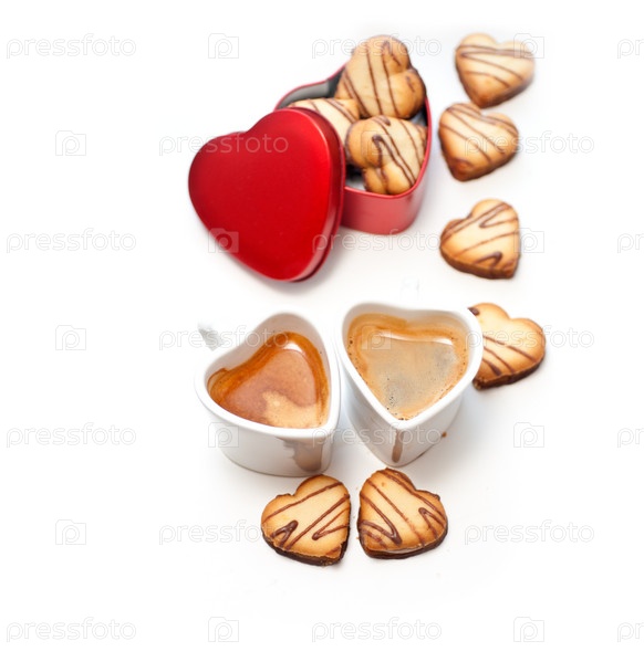 Печенье в форме сердца в красной металлической коробке и два кофе эспрессо