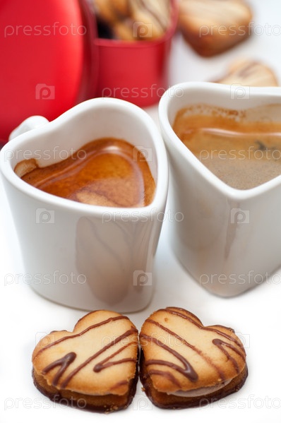 Печенье в форме сердца в красной металлической коробке и два кофе эспрессо