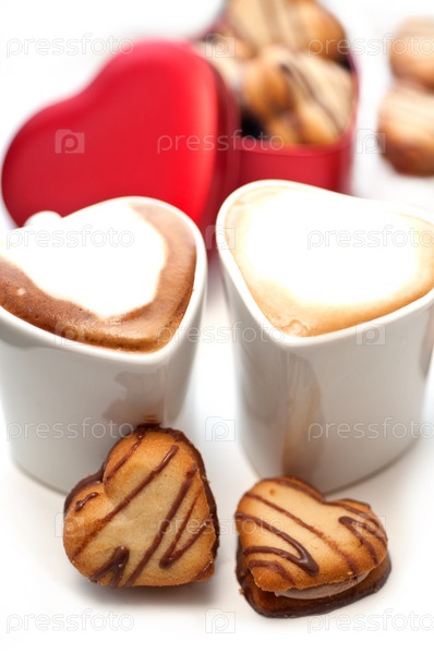 Печенье в форме сердца в красной металлической коробке и два кофе эспрессо