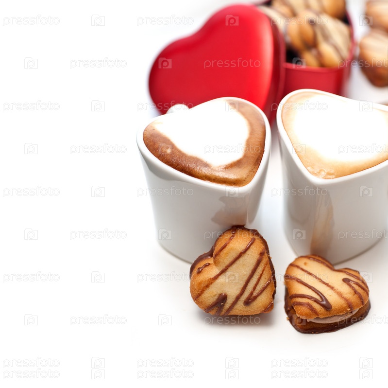 Печенье в форме сердца в красной металлической коробке и два кофе эспрессо