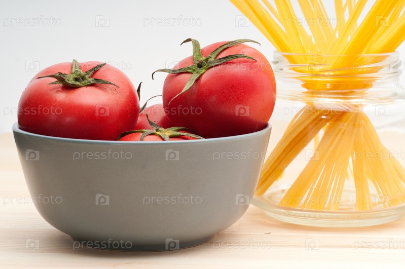 Свежие помидоры и сырые спагетти на сосновом столе