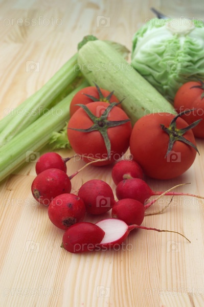 Свежий редис и овощи крупным планом на сосновом столе