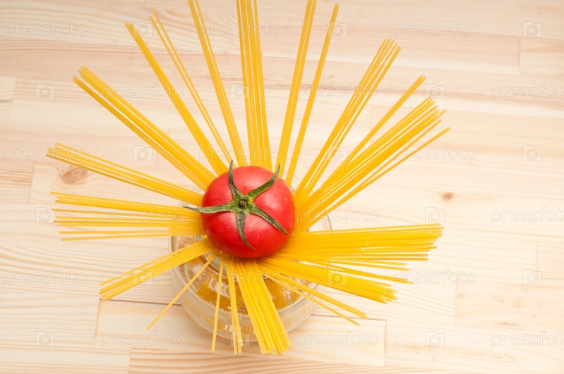 Свежие помидоры и сырые спагетти на сосновом столе