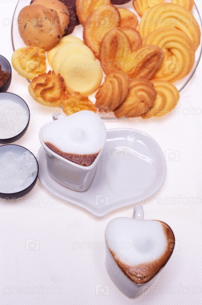 Две чашки кофе эспрессо в форме сердца, печенье и коричневый сахар на день святого Валентина