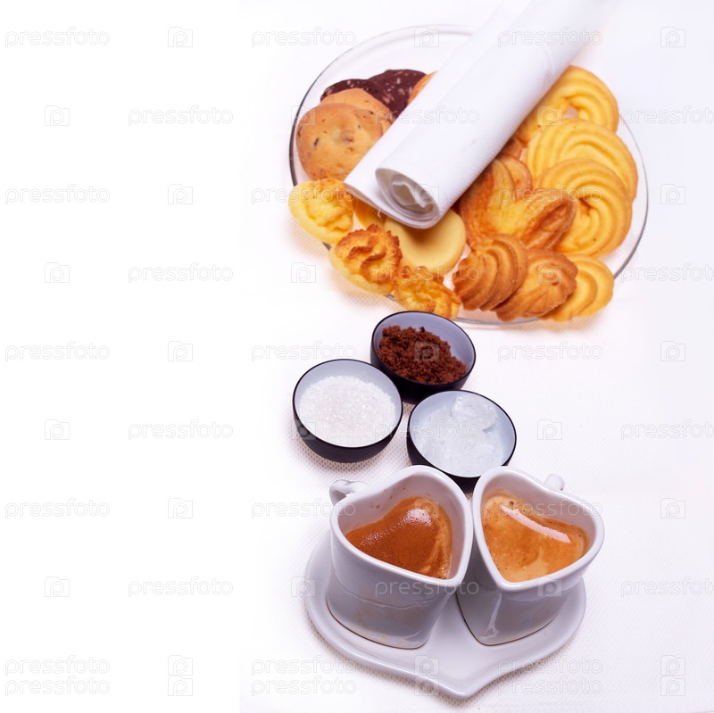 Две чашки кофе эспрессо в форме сердца, печенье и коричневый сахар на день святого Валентина