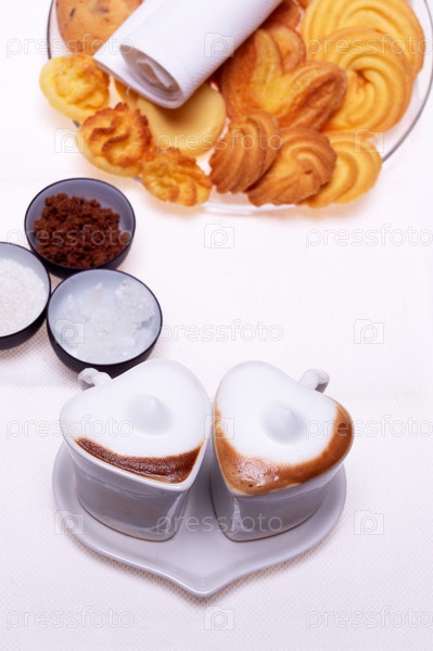 Две чашки кофе эспрессо в форме сердца, печенье и коричневый сахар на день святого Валентина