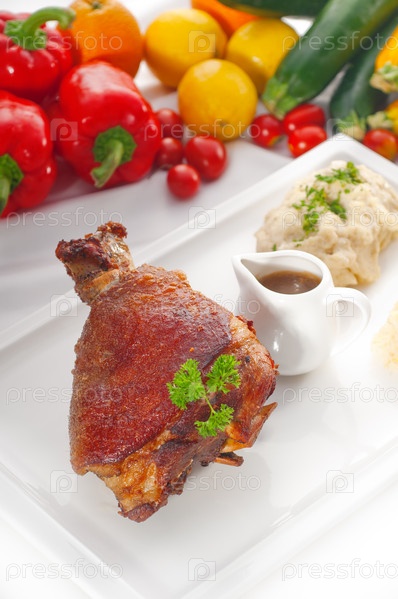 Немецкая свиная рулька-барбекю с картофельным пюре, квашеной капустой и свежими овощами
