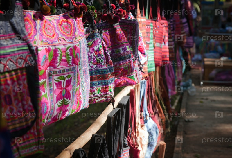 Яркие сумки висит в ряд на рынке