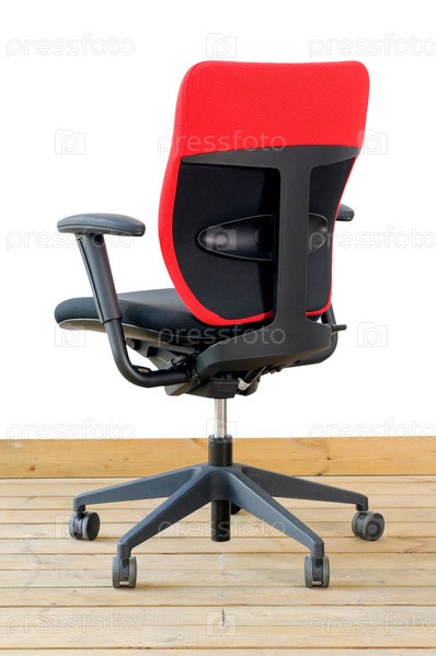 Современное красное офисное кресло на деревянном полу на белом фоне
