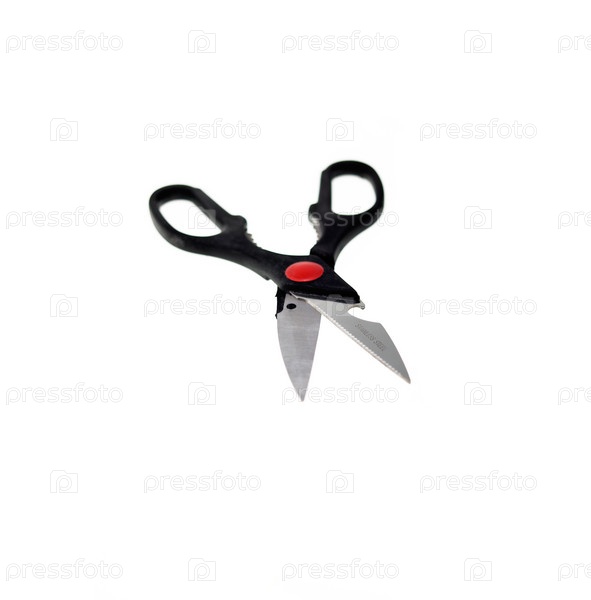 Открытые ножницы из нержавеющей стали крупным планом, изолированные на белом фоне