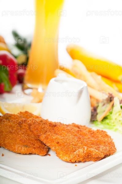 Классические миланские котлеты из телятины в панировке с картофелем фри, овощами и стаканом светлого пиво