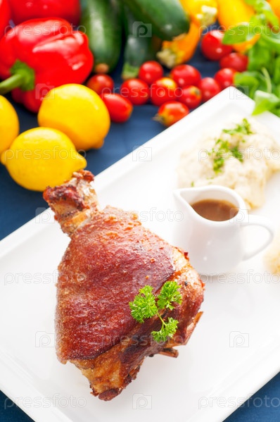 Настоящая немецкая свиная рулька, приготовленная на барбекю, с картофельным пюре, квашеной капустой и свежими овощами