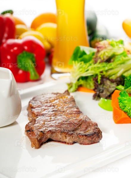 Стейк рибай, приготовленный на гриле, овощи и светлое пиво