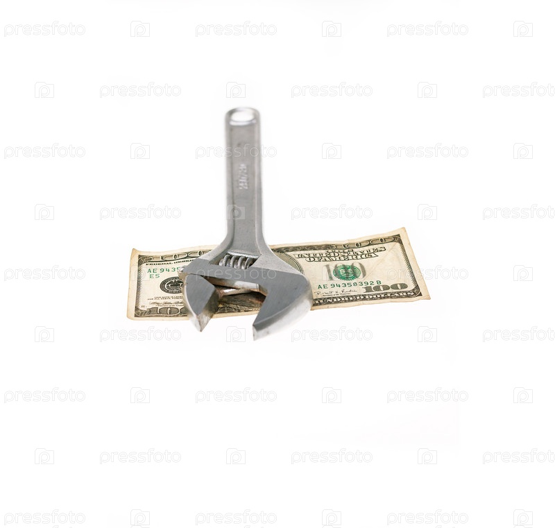 Гаечный ключ и долларовая купюра на белом фоне крупным планом