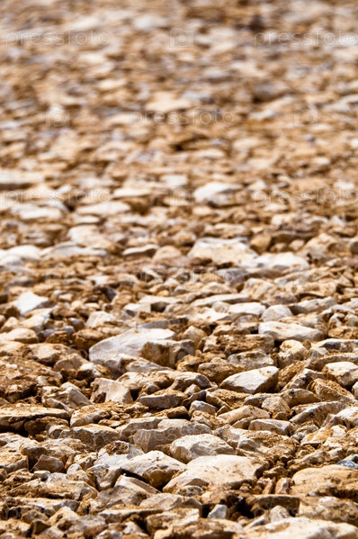 Коричневый гравий на строительной площадке. Крупные камни, выровненные тяжелой техникой