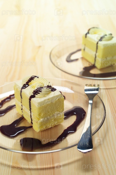 Свежий торт с шоколадным сиропом крупным планом