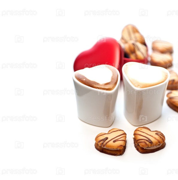 Сливочное печенье в форме сердца в металлической красной коробке и пара чашек капучино