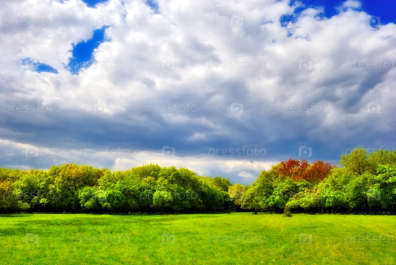 Облачное небо над зеленым весенним лесом