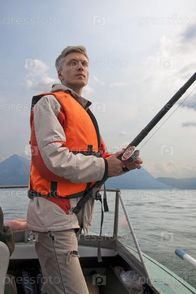 Рыбак, одетый в оранжевый спасательный жилет, держит удочку и смотрит вдаль